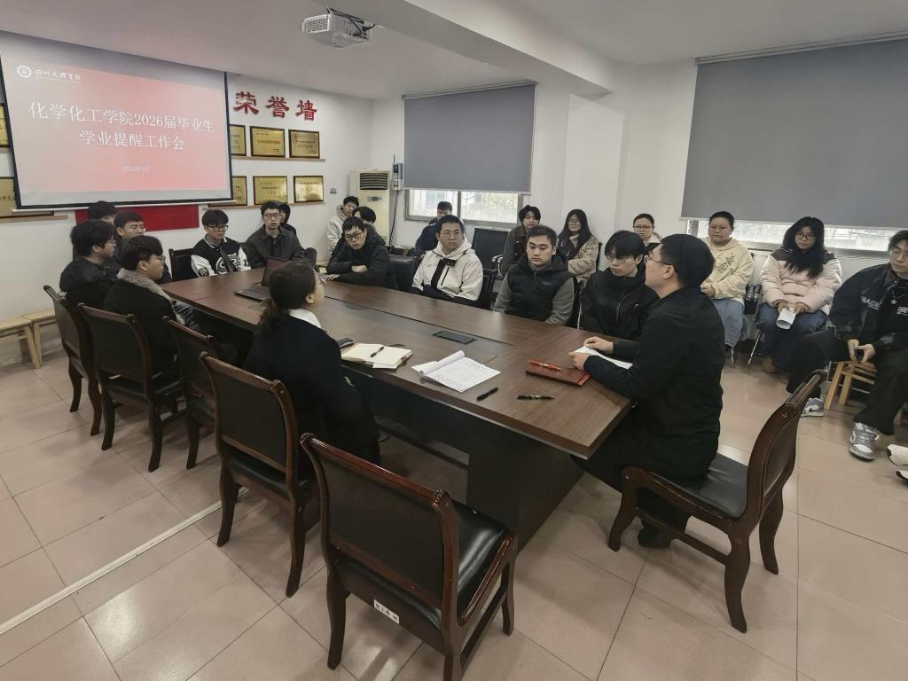 3月18日,化学化工学院针对大四年级学生召开学业提醒专题会议。学院院长赖川、学工办主任崔宝玉、教科办刘华老师出席会议,相关学生参加会议。