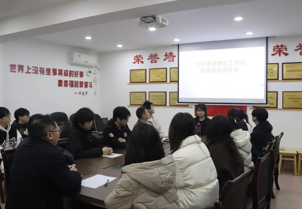 为引导学生常怀感恩之心、恪守诚信之本,树立正确的价值观与道德观,2025年11月14日,化学化工学院于行政楼302会议室召开2025年度“感恩诚信”主题教育座谈会。本次座谈会由专职辅导员罗云主持,学院党委书记向文军出席并讲话,全体专职辅导员及近50名获国家资助的学生代表参与。