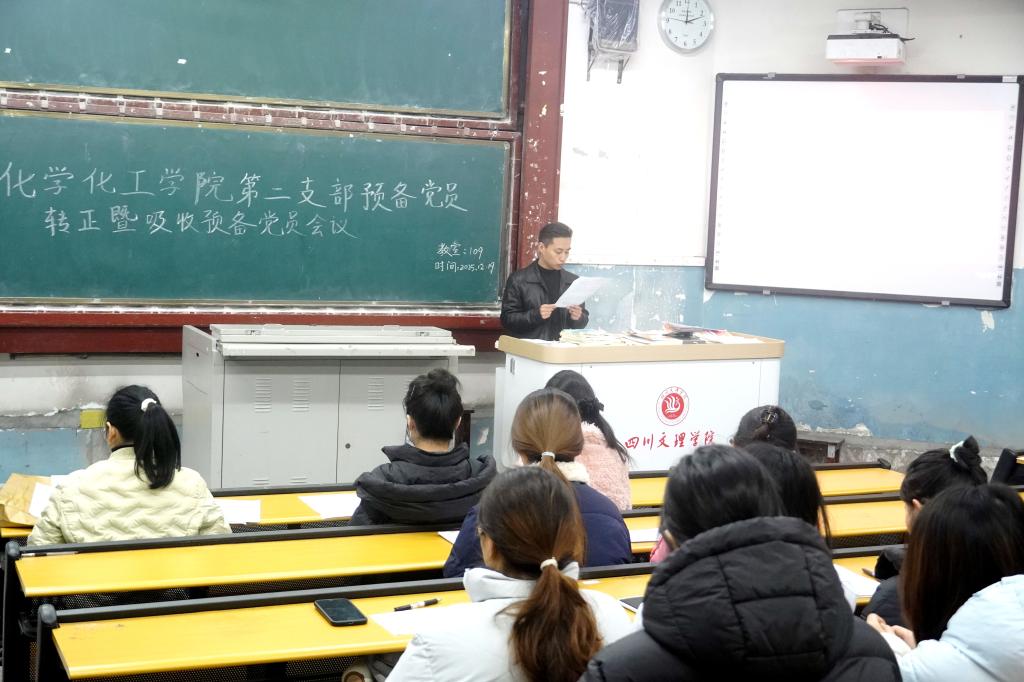 为贯彻二十大精神,规范党员发展工作,提升党员队伍质量,2025年12月19日中午12点,化学化工学院学生第一、第二党支部分别在南坝校区一教楼100和109教室召开预备党员转正大会。大会分别由学生第一党支部书记李苹、第二党支部书记崔宝玉主持。
