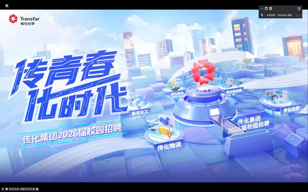 为切实推动毕业生高质量就业,搭建校企人才供需对接桥梁,2026年3月11日,化学化工学院组织毕业生通过线上平台参加浙江传化合成材料股份有限公司招聘宣讲会。此次会议由传化合成材料股份有限公司负责人李懿主讲,化学化工学院就业联络员王练练及二十余名毕业生参会。