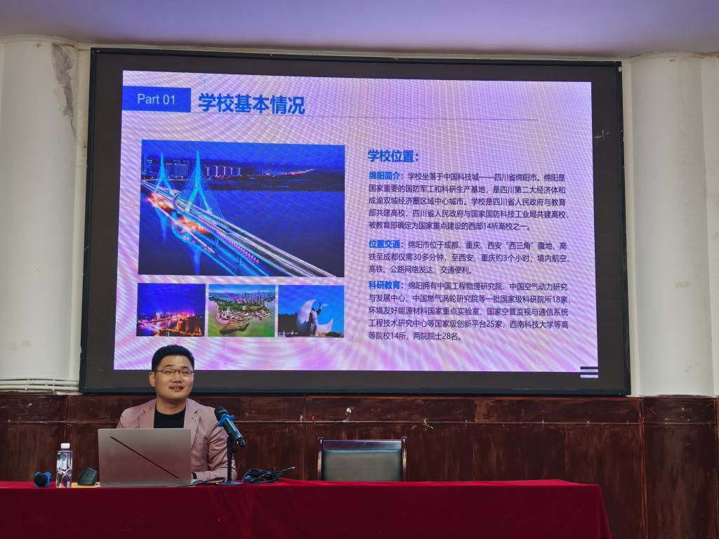 活动伊始,陈春坛主任对陈涛教授的到来表示热烈欢迎。随后,陈涛教授详细介绍了西南科技大学与国防科技学院的整体概况、师资力量、科研平台与招生政策。针对招生细则,陈教授解读了招生方向、考试科目及调剂政策,重点阐述了相关专业的特色优势及完善的奖助体系。