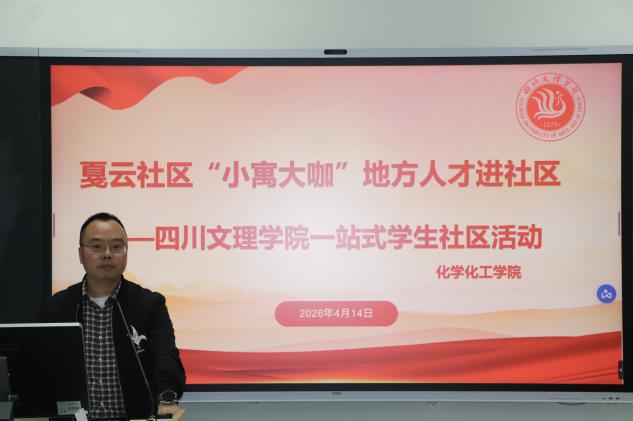 为深化校企协同育人,帮助学生把握行业动态、明确学业与职业发展方向,2026年4月14日,化学化工学院在戛云社区开展“小寓大咖”地方人才进社区一站式学生社区活动。本次活动特邀瓮福达州化工有限责任公司工程技术部副经理、高级工程师叶国成担任主讲,学院专职辅导员李苹及部分毕业生到场参与。