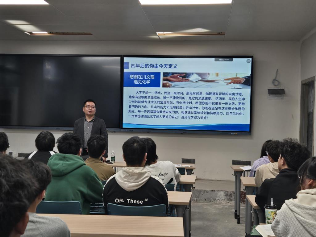 近日,我院优秀校友开江县第二中学校长、中学化学高级教师谭军应邀莅临学院,为化学专业2025级全体师范生带来了一场题为“让遇见化学成为美好”的专业导论课。本次讲座旨在引导大一新生夯实专业根基,明晰职业方向,化学专业教师及高年级学生代表共同聆听了讲座,现场学术氛围浓厚。