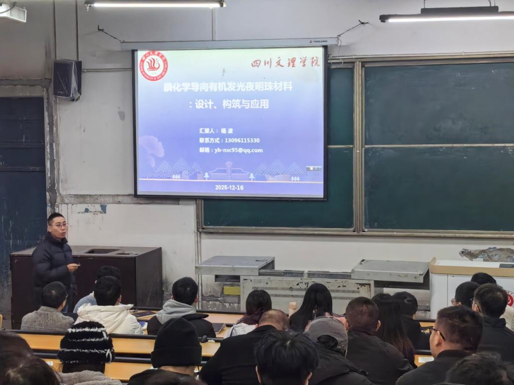 20251216日,由学校党委组织部、科技处主办,化学化工学院承办的化学化工学院博士学术沙龙系列讲座第7讲暨四川文理学院塔石人才特区学术沙龙第40期在南坝校区弘致楼111教室举行。本次学术沙龙由杨波博士主讲,教师及学生代表参加。学术沙龙由黄小梅副院长主持。