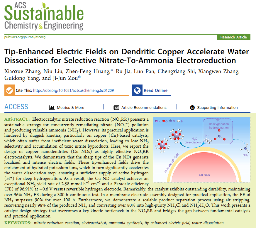 近日,我院青年教师章小雪博士以第一作者身份,在《ACS Sustainable Chemistry & Engineering(中科院一区TOPIF=7.3)上发表题为《Tip-Enhanced Electric Fields on Dendritic Copper Accelerate Water Dissociation for Selective Nitrate-To-Ammonia Electroreduction》的研究论文(DOI: 10.1021/acssuschemeng.6c01209; https://pubs.acs.org/doi/10.1021/acssuschemeng.6c01209)。该成果以我校为第一完成单位,天津大学化工学院为通讯单位。